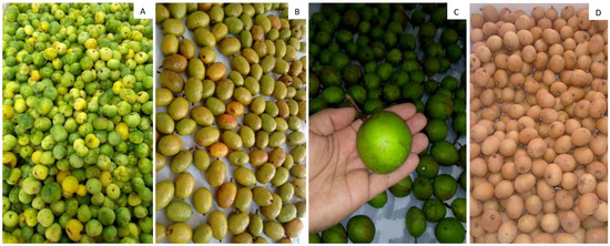 The harvests of cagaita, seriguela, mangaba and pitomba fruits occurred during the months of November to January, November to February, December to March and January to March, respectively. Fruits were considered ripe and ready for harvest when they had the following characteristics: pitomba fruits were totally green with brown peel; mangaba fruits were totally green, with yellowish-green peels and red pigmentation in half of the fruit; seriguela fruits had an onset of red pigmentation on the peel; and cagaita fruits were totally green with the green/yellowish peel on half of the fruit, following the local traditions for harvesting the fruits (Figure 1).