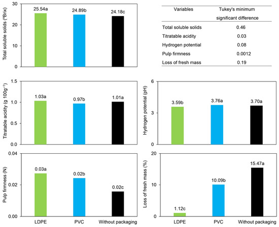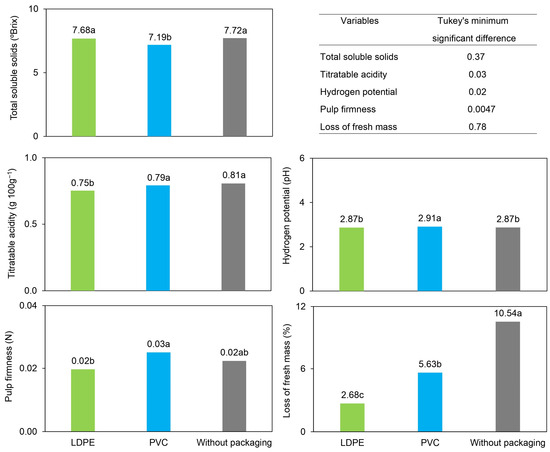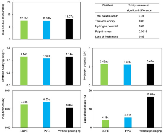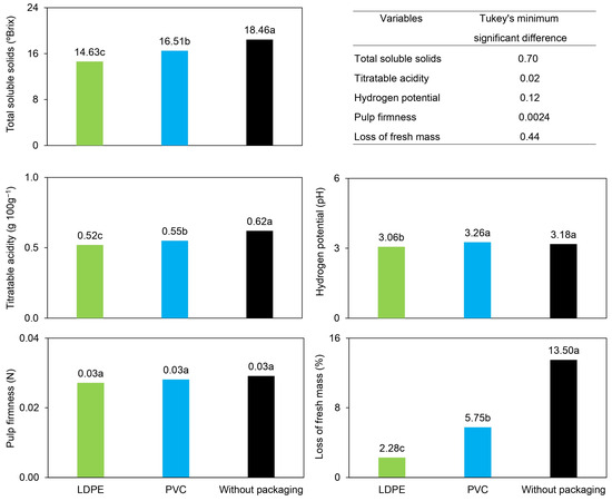 Total soluble solids, titratable acidity, hydrogen potential, pulp firmness and loss of fresh mass of mangaba fruits stored in different types of packaging. LDPE—low-density polyethylene; PVC—polyvinyl chloride. Letters indicate significant differences among treatment and control samples (p < 0.05).
