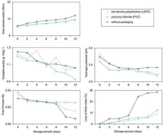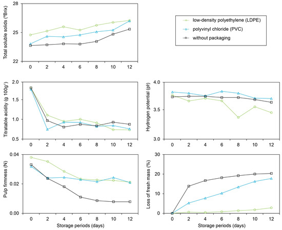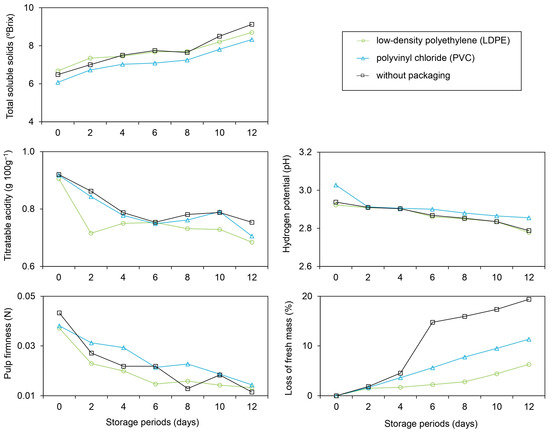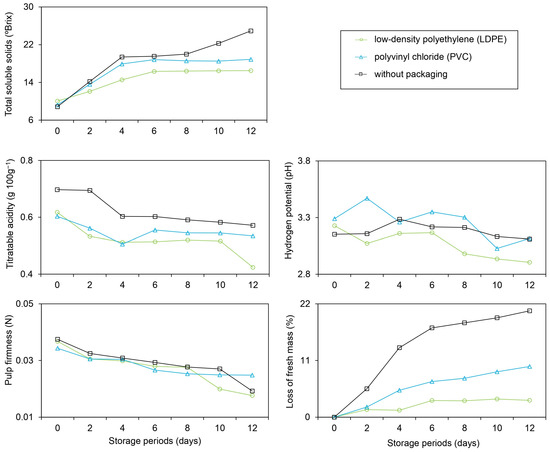 Total soluble solids, titratable acidity, hydrogen potential, pulp firmness and loss of fresh mass of cagaita fruits stored in different types of packaging. LDPE—low-density polyethylene; PVC—polyvinyl chloride. Letters indicate significant differences among treatment and control samples (p < 0.05).