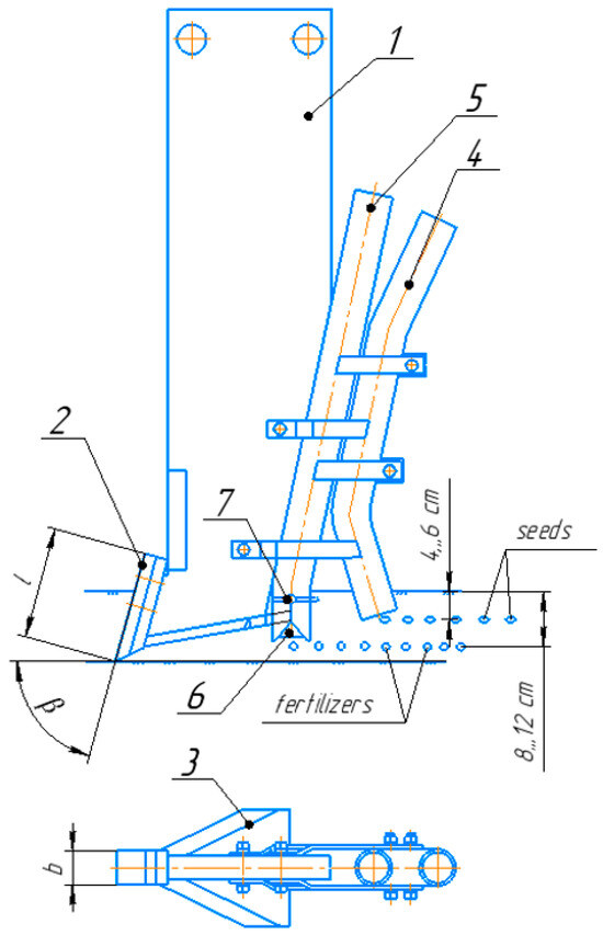 Figure 2. Schematic diagram of the working body with main parameters: (1) work body shank, (2) chisel, (3) knife, (4) seed tube, (5) fertilizer tube, (6) spreader, (7) splint; (b) coulter chisel width, (l) coulter chisel length, (β) rear mounting angle to the horizon.