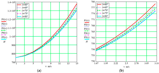 Figure 4. Dependences of traction force on the speed at different mounting angles: (a) velocity range υ = 1 ÷ 15 m/s; (b) velocity range υ = 1.67 ÷ 3.33 m/s (enlarged view).