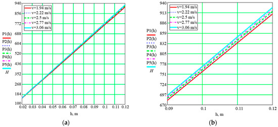 Figure 5. Dependences of traction force on seed embedment depth at different speeds: (a) range of embedment depth h = 0.02 ÷ 0.12 m; (b) range of embedment depth h = 0.09 ÷ 0.12 m (enlarged view).