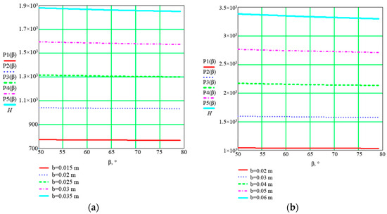 Figure 6. Dependences of traction force on the mounting angle at different widths: (a) width range b = 0.015 ÷ 0.035 m; (b) width range b = 0.02 ÷ 0.06 m.