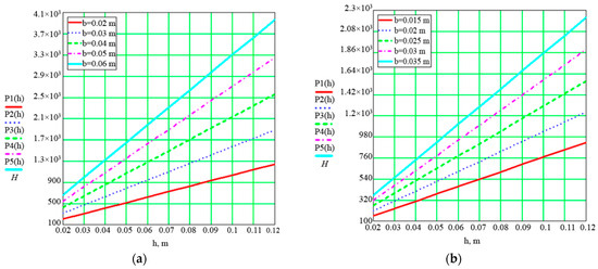 Figure 7. Dependences of traction force on seed embedment depth at different widths: (a) width range b = 0.02 ÷ 0.06 m; (b) width range b = 0.015 ÷ 0.035 m.