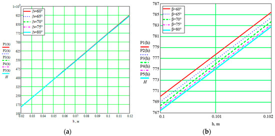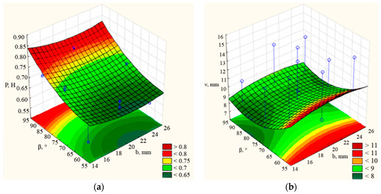 Figure A1. Dependences of traction force P and seed embedding depth unevenness H on the mounting angle of the rear part to the horizon (β) and chisel width (b) at length at l = 145 mm: (a) P = f (b, β); (b)   ν d = f (b, β).