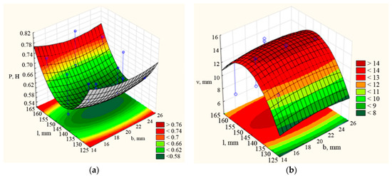 Figure A3. Dependences of traction force P and seed embedding depth unevenness νd on the length (l) and width (b) of the coulter chisel at the mounting angle β = 75°: (a) P = f (l, b); (b) ν d = f (l, b).