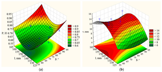 Figure 10 presents the surface responses of dependences P = f (l, b). According to the graphs, it can be noted that with increasing the mounting angle of the rear part to the horizon, the maximum and minimum values of the traction force dependence on the width (b) and length (l) of the coulter chisel also increases. At the value of the mounting angle of the rear part to the horizon β = 70° ÷ 75°, the traction force has optimal values between 0.6 ÷ 0.7 kN, with a maximum value of 0.8 kN. As can be seen from the graphs in Figure 10a, Figure A3a and Figure A4a, the traction force decreases at widths of 18–24 mm and lengths of 140–150 mm. When the mounting angle of the rear part to the horizon increases, the value of dependence of the seed embedment depth unevenness νd on the width (b) and length (l) of the coulter chisel decreases. At the value of the mounting angle of the rear part to the horizon β = 75° ÷ 90°, the seed placement depth unevenness νd have almost the same values (Figure 10b, Figure A3b and Figure A4b). At all ranges of the mounting angle, the optimum value of the variation coefficient is at a length of 125–130 mm. Based on this, it can be concluded that the average width and length values at a mounting angle of 75–90° are required to reduce the traction force. However, at this mounting angle, the seed embedment depth unevenness should be reduced to a minimum value of length. In this case, the tendencies of the chisel width range are irrelevant.