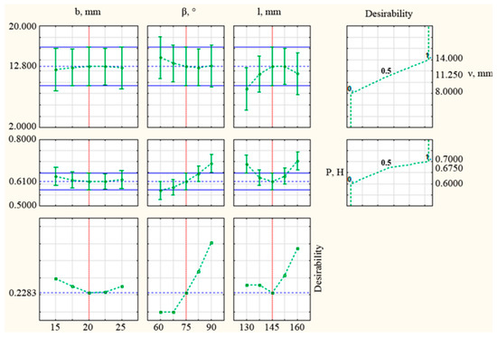 The desired optimum values (Table 5 and Table 6) of the design parameters and the profiles of the predicted values and desirability functions were obtained in the Statistica program (Figure 12).