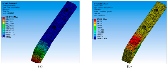 The zone of maximum deformation and dangerous wear is in the nose part of the chisel, as shown in Figure 13a. At the same time, a red-colored hazardous zone is observed, which can lead to cracks and chipping on the chisel. The simulation results show that for the chernozem in the working part, the maximum normal stress is 65.038 MPa (Figure 13b) and the shear stress is 22.601 MPa (Figure 13b and Figure A7a,b). The chisel was loaded directly with the pressure corresponding to the depth of treatment: Pmax = 2.00 MPa, Pmin = 0.7 MPa for chernozem. The distribution of equivalent von Mises stresses on the model subjected to pressure is presented in Figure 13b and Figure A7a,b. During soil embedding, the wear value of the working part is in the cantilever part, which hangs freely from the anchoring point in the rack. According to the modeling results in ANSYS, it can be concluded that the soil of the chernozem type (dark chestnut soils with moisture content of 25–45%, soil clogging with stones with an average diameter of 50 mm was 0.6–1.5 pcs/m2) can take high yield or shear stresses due to the strength of bonding between particles or between particles and aggregates, which leads to small deformations in these types of textures. The investigated width of the seeder implement corresponds to the soil type and pressure presented.
