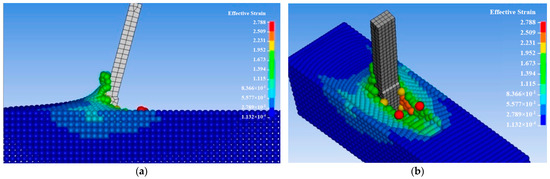 The next task in modeling was to exclude turf swelling in places after the pass and to justify the geometric parameters and mounting angles of the chisel. To solve this problem in modeling, the SPH method in LS-DYNA was applied. The width of 20 mm and the mounting angle of 75° were taken as the chisel’s geometrical parameters.