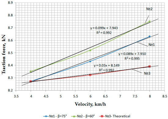 It is explained by the fact that at the initial moment of tool–soil interaction, inertial forces arise because, at that moment, the inertia of the soil rest is broken, and its particles acquire certain accelerations and some absolute speed, which does not coincide with the slope line. Obviously, the inertial force will be directed along the line of absolute particle velocity only in the opposite direction. In the steady-state process of soil destruction, the traction force is minimal. However, the traction force also increases with further translational speed.