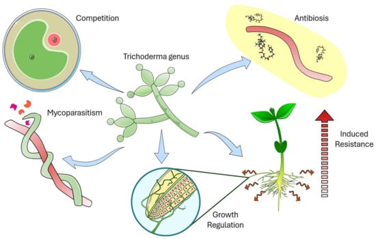 - T. harzianum: Known for inducing systemic resistance in plants through the production of enzymes and metabolites that stimulate plant immune responses and enhance growth. It is also effective in environments where chemical fungicides are ineffective due to its ability to efficiently colonize plant roots and persist in the soil [124].