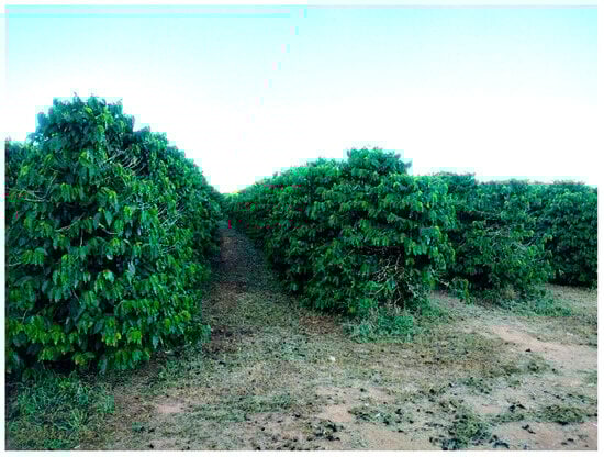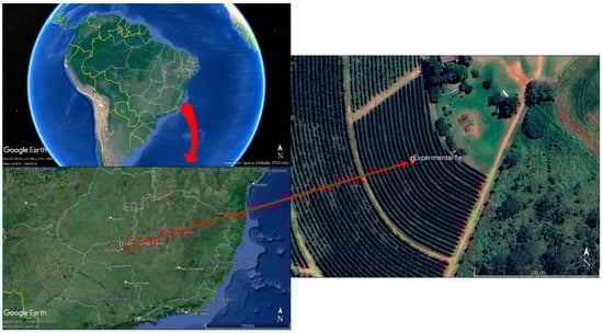 This study was conducted at the Coffee Production Sector of the Federal University of Uberlândia in Uberlândia, MG, Brazil (18°58′52″ S latitude, 48°12′24″ W longitude, and 912 m altitude) (Figure 1). According to Köppen’s classification, the region experiences a tropical wet and dry climate (Aw) with hot, humid summers and cold, dry winters. Average monthly air temperature ranges from 20.9 to 23.1 °C, with annual average rainfall between 1500 and 1600 mm [10]. The area has a gently undulating terrain.