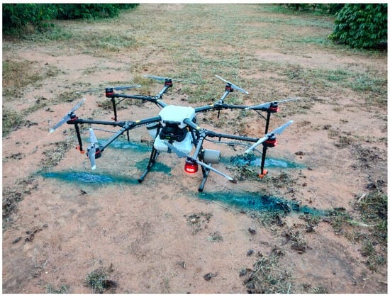 The RPA used was an AGRAS MG-1P octocopter (DJI, China) equipped with a 10 L spray tank, four spray nozzles, and eight motors (Figure 2). All treatments employed a four-meter swath width, a working height of 1.5 m above the coffee canopy, and a forward speed of 12.2 km h⁻¹. Two spray volumes were evaluated (10 L ha−1 and 20 L ha−1). The RPA utilized XR 11001 flat fan spray nozzles (Teejet, Glendale Heights, IL, USA) designed to produce very fine to fine droplets in accordance with the operating pressure (factory-installed). The flight path of the RPA was perpendicular to the planting rows.