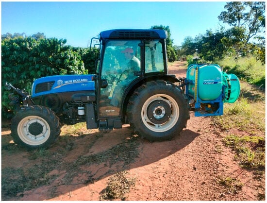 The airblast sprayer used was an Arbo360 (Montana, São José dos Pinhais, PR, Brazil), equipped with a 300 L tank, a spray pump (working at 40 L min⁻¹), a manual section control, and a fan with a 615 mm diameter, and nine fixed-angle blades. The equipment had six nozzle holders on each of the two sides, fitted with yellow ATR hollow cone spray nozzles (Albuz, Évreux, Eure, France) made of ceramic. These nozzles feature an 80° spray angle and produce a very fine droplet spectrum according to the manufacturer. The sprayer was pulled by a New Holland T4 4 × 2 tractor with auxiliary front-wheel drive and 62.5 kW power (Figure 3).