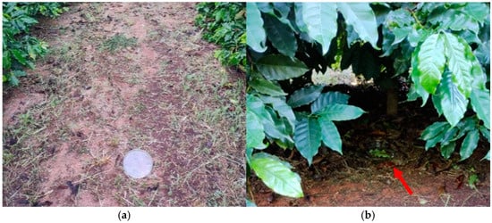 Placement of the Petri dishes used for assessing spray losses to the soil: (a) center of the inter-row; (b) beneath the coffee canopy.