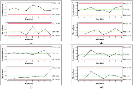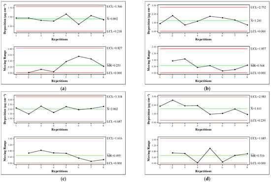 Additionally, to evaluate whether the spray deposition on coffee leaves was within acceptable variability, control charts were built as part of the statistical process control (SPC) tools used to monitor process quality [14]. Individual control charts were built using individual measurements from each treatment, and moving range charts were used for variability between two consecutive measurements, following the methods described by Montgomery [15].