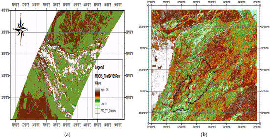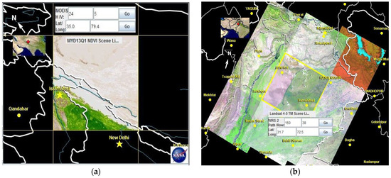 Preparation and Pre-processing of RS Data, before classifying the images for land use mapping, required some preparation and pre-processing because they were not produced for any special study. Data from both the sensors MODIS and Landsat5 TM was first prepared as required for the study. MODIS VI data which were procured from NASA’s remote sensing data center, was HDF format, which is not importable in ERDAS Imagine and ArcGIS. Additionally, the tile size of these data were very large, which was difficult to process. For the sake of simplicity and ease and to make the data importable in image analyzing software, it was converted to TIFF (Tagged Image File Format). Along with the format conversion, the images were clipped to retain only the study area (Rechna Doab) composite with an NDVI parameter layer. The procedure was performed using hegWINv2.1, which transformed raw HDF images into GeoTIFF format and reprojected them from the Integerized Sinusoidal (ISIN) projection to a geographic projection (latitude/longitude, World Geodetic System 1984-WGS84). [14]. The clipped image with the parent image file is shown in Figure 2a,b.