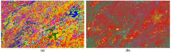 Multi-temporal MODIS 250 m NDVI images showed good potential for detecting crop-related LULC mapping, cropping periods, and crop rotations at a regional scale or command level. This was performed due to the high temporal, moderate spatial, good spectral resolutions, and global coverage of MODIS [11]. Figure 4 illustrates the effectiveness of MODIS time series imagery by comparing it with a single-date multi-spectral Landsat TM image.