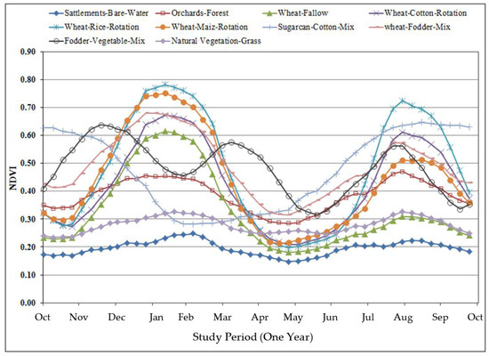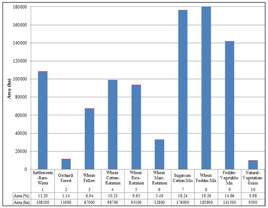The areal extent of each land cover class for the unsupervised classification results is summarized and represented in Figure 7. Wheat–fodder mix with 175,900 ha is the class with the maximum areal extent, but wheat is the most prominent crop of the Rabi season. The agriculture of this region is irrigated, about 75% to 80% through canal irrigation and the other 20% to 25% by tube well. The NDVI phenological patterns in Figure 5 reveal predominant biennial cropping cycles, with major crop rotations including wheat–cotton (10.23%), wheat–rice (9.65%), wheat–maize (3.40%), wheat–fodder–mix (19.26%), and sugarcane–cotton–mix (18.24%). Sugarcane and wheat appeared to be the most prominent crops, with an estimated area of 176,000 ha and 477,500 ha, respectively, which were found to be 80% and 94% accurate when compared with the reported area by the Punjab Board of Statistics. This can be explained by the fact that the total area of one pixel is 6.25 ha (250 m × 250 m), which is 15.44 acres, and the land within one pixel does not consist of agricultural fields with homogeneous crops. The field unit size in this region is 1 acre, and the land holding pattern of the region is very small. A survey reported that about 83% of the respondents have less than 10 acres of land holding.
