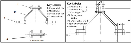 The hitch system, also known as Mast A-Frame, was used for the attachment of the implement to the tractor. In this seeder, a category-2-type three-point hitch assembly was designed on the basis of the implement structure and weight. The upper hitch attachment (1) has a hole diameter of 26 mm to facilitate a pin of 25 mm easily, as shown in Figure 2. The lower hitch attachments (4) were designed as a clevis type, with a hole diameter of 29 mm to facilitate a pin of 28 mm. The distance between the two inner faces of yokes (W1) was set to 52 mm and the distance between the outer faces of yokes (W2) was 86 mm. The mast height (H) between the top link and lower attachment was fixed at 610 mm and the span of lower attachment (S) was fixed at 825 mm.