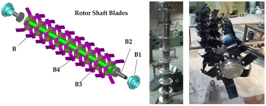 As the paddy straw is more viscous and offers high resistance to shredding, to handle this type of straw a special type of blades (“C”, “J”, and “JF”) were used. For the tillage operation, “C”-shaped blades required less power and the physical properties of soil were checked by observing the following factors: structure and porosity/bulk density [55,56]. The blade material was medium carbon low-alloy steel with a hardness of 50 HRC. The rotor (B3) was made of mild steel pipe with an outer diameter of 90 mm and a wall thickness of 7 mm. The total rotor length was 1915 mm, including neck-shaped flanges (B2) welded on both sides to hold and rotate through the bearing hub (B1). Nine forged mild steel (FMS) plates (B4) were welded on the rotor shaft with equal spacing. Each 12 mm thick plate was designed for mounting six “C”-shaped blades (B) and had a diameter of 260 mm, as shown in Figure 3.