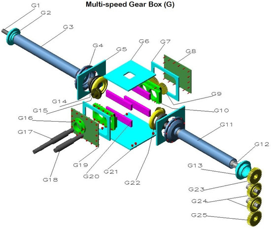 To drive the rotor shaft of the precision seeder, power is transferred via a Power Take Off (PTO) shaft through a multi-speed gearbox. A heavy-duty special gearbox was designed to transmit the power to both the blade rotor shaft and the trencher shaft at a multitude of speeds, as shown in Figure 4. The main shaft (G17) is powered by the PTO of the tractor and drives the left shaft (G1) through spiral bevel gears (G15) and also drives the right shaft (G12) through a pair of spur gears (G9) leading to a spiral bevel gear set (G22). At the rear end of the gearbox, an opening (G7) allows for the interchange of the two spur gears (G9). Three identical pitch spur gears with 16, 18, and 20 teeth can be interchanged in different combinations to obtain different speed ratios.