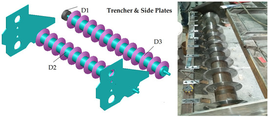 To power the trencher rotor, a heavy-duty timing belt was used with the drive mechanism of the timing belt and pulleys [60]. The drive shaft pulley diameter was fixed at 150 mm and the trencher rotor shaft pulley diameter was fixed at 225 mm.
