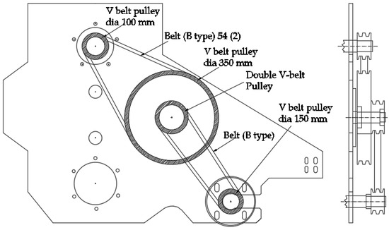In this mechanism, power was transmitted through a B-type double V-belts and pulley system (Figure 6). The driveshaft pulley diameter of 100 mm was driven to a middle pulley diameter of 350 mm that also held a counter pulley with a diameter of 125 mm that was driven to a trencher pulley with a diameter of 150 mm.