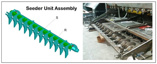 Seeder units were designed for efficient placement of wheat seed and fertilizer in the mini trenches (Figure 7). Each seeder unit (S) has provision for the separate placement of fertilizer and wheat seed. The first slot was designed for the fertilizer, while the second was for wheat. Each unit was formed from a 3 mm MS sheet via a tooled press and spot-welding process. The end of the seeder was closed to the soil, heat treated to a Rockwell C hardness of 40, and welded directly behind the trencher plates for the best placement of fertilizer and seed. Seed and fertilizer were conveyed through hoses connected to the seed and fertilizer box. A roller (R) was provided at the rear end to apply the layer of soil cover on seed and fertilizer.