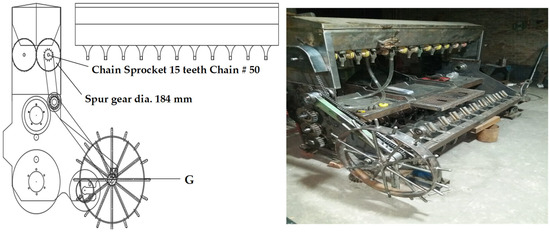 The quantity of seed and fertilizer was set by moving the position of the fluted roller. A 685 mm diameter ground contact wheel, also known as the drive and calibration wheel (G), was attached to calibrate the seed and fertilizer amount, as shown in Figure 9. The seed and fertilizer rates in kilograms per hectare were calculated individually using Equation (10).