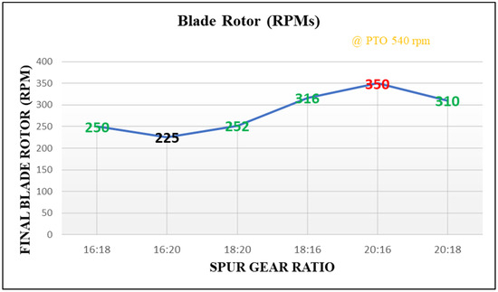 The design of the rotor blades was carried out based on the available power source of a 75 HP tractor. This tractor has technical specifications and other performance parameters: the torque value is 290 N·m at 1400 PRM of the engine and the power available at a PTO is 69.5 HP at the rated speed of the engine [57].