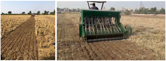 The direct sowing of wheat in the rice field without burning straw after rice harvesting through a combine harvester reduces environmental pollution [23,24]. Rice residue is comprised of standing stubble in the range of 30–60 cm high, along with loose straw in windrows ∼1 m wide in a substantial quantity after combine harvesting [25,26]. For wheat sowing, loose straw interferes both in tillage and seeding operations [27]. Multiple tillage operations were required for the proper incorporation of straw into the soil [28]. In Punjab, after the partial burning of rice residues, usually five tillage operations were performed by 50% of farmers, and 30% used to till four times after complete burning [29].
