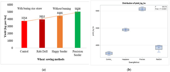 Wheat yield under different sowing methods. (a) Bar graph describes the yield (kg/ha), with a baseline of the first two methods with burning, while the other two methods are without the burning of the rice straw. (b) Boxplot of mean with F-score.