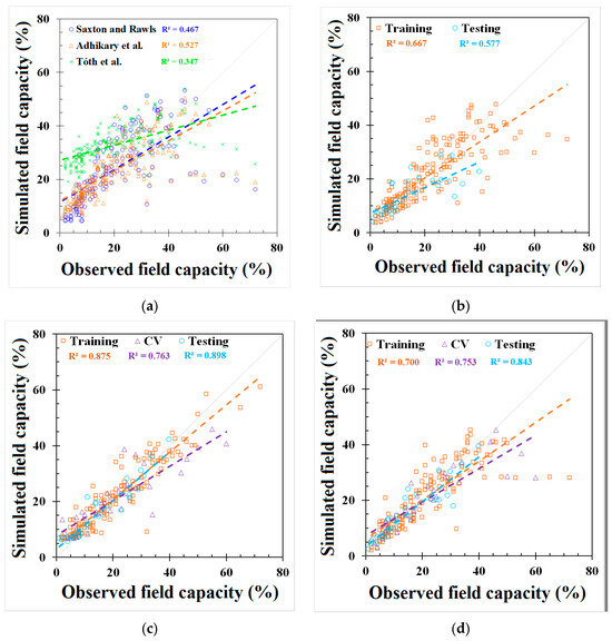 Modeling results of field capacity (FC) from (a) Saxton and Rawls, Adhikary et al., and Tóth et al. models, (b) REG model, (c) ANN model, and (d) GEP model.