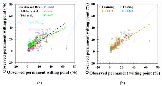 Plant available water capacity provides information on the amount of water that is stored in soil and can be used by plants, which is determined by the differences between the soil field capacity (FC, −33 kPa of suction pressure) and the permanent wilting point (PWP, −1500 kPa of suction pressure) [1]. While the FC and PWP are critical for understanding soil water dynamics, it is important to clarify that these parameters primarily reflect the hydrological aspects of soil rather than direct measures of soil health. These properties are integral to applications such as irrigation management [2], crop modeling [3], and precision agriculture [4]. However, the FC and PWP of soil are often not available because their measurements are both time-consuming and costly [5,6]. In the latest soil health database, SoilHealthDB [7], only 81 results for the FC and PWP were reported out of 5908 data entries across 41 countries. This paucity of direct data underscores the urgent need for more efficient and cost-effective methodologies to estimate these crucial soil parameters. Therefore, the capability to estimate the FC and PWP from other easily measurable parameters is highly desirable [8]. Historically, pedotransfer functions (PTFs) have been applied to derive FC and PWP values based on parameters like soil texture, soil bulk density, and soil organic matter (SOM) [9,10]. These traditional methods, while noble in their intent, have been fraught with challenges, most prominently their limited accuracy. In an innovative push to enhance the precision of these models, parameters like the soil cation exchange capacity (CEC) [11], soil calcium carbonate (CaCO3) content [12], geographical locations [13], and even geographical nuances [13] have been incorporated. Past efforts have shed light on the limitations of conventional models. For instance, Santra et al. [9] calculated the gravimetric FC and PWP in arid western India with sand, silt, and clay contents; organic carbon; and bulk density as input variables of PTF. The results showed that the coefficient of determination (R2) of best-fit FC and PWP was 0.63 and 0.34, respectively. Cueff et al. [14] used CEC and phosphorus content as additional inputs in addition to those used by Santra and colleagues to model the FC and PWP for soil in southwest France. The root mean squared error (RMSE) of their model ranged from 3.7% to 8.0% for the FC and 3.4% to 5.7% for the PWP. A significant drawback of previous efforts is the reliance on linear algorithms, which have inherently restricted the accuracy of these models [15,16].