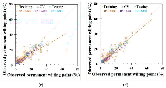 To systematically elucidate the criteria behind the selection of variable combinations for FC and PWP modeling, our approach was grounded in a comprehensive analysis of soil properties’ interactions and their predictive significance. The modeling results from combinations of different inputs are shown in Table 2. The selection process was rigorously informed by a review of the existing literature and empirical evidence demonstrating the individual and combined effects of these properties on soil hydrology. In the FC model, the combination of L + S + EC resulted in the best performance. In the PWP simulation, L + S + pH + EC led to the highest accuracy. While the individual L and S datasets appeared to generate reasonable FC and PWP predictions, the combination of L + S generated more accurate FC and PWP simulations. Interestingly, while the model performance using ionic strength or EC alone as the input variable was quite low, their combination with L + S significantly enhanced the model performance in predicting both the FC and PWP. Previous studies suggested that EC is more sensitive to soil water variation [48,49] because the relative dielectric permittivity of water is generally more than an order of magnitude larger than that of other soil components [50]. As a result, the bulk relative dielectric permittivity of soil is primarily a function of the soil water content (SWC) [51]. The pH appears to have lower impact on the FC than the PWP, because the SWC easily fluctuates with the salinity content in the environment [52]. Chronically high or low pH has been found to cause soil water storage variation [26], but the SWC does not significantly change with rapidly varying pH. In addition, pH in the environment is relatively stable due to the carbonate buffering capacity, thus, its impact on SWC is not significant [53].