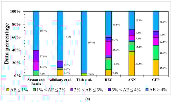 For the model error distribution analysis, the comprehensive modeling capacity of each model was evaluated by above-mentioned indicators. However, R2 only describes the model’s responded variation between dependent variables and independent variables. RMSE, NRMSE, and MAE are averaged errors that cannot represent the error distribution, i.e., indicating the primary range of the error. In order to evaluate each model’s error distribution, the absolute error (AE) was utilized in the testing dataset of each model for both the FC and PWP (Figure 4). Five categories were used, including AE ≤ 1, 1 < AE ≤ 2, 2 < AE ≤ 3, 3 < AE ≤ 4, and AE > 4. Figure 4a shows the AE distribution in the FC model. All linear-based models have lower accuracy (AE ≤ 1%), ranging from 0% to 9.4%, and an unignored error (AE > 4%) from 40.6% to 96.4%. In contrast, ML-based ANN and GEP models demonstrate better simulation ability (AE ≤ 1%) from 25.0% to 37.5% and the massive error (>4%) is from 28.1% to 31.3%. Over 60% of AEs in the three PTFs in previous studies are greater than 4% although the FC modeling result from the study of Adhikary et al. [36] presented an acceptable R2 (0.683), but around 78.1% of AEs were higher than 4%.