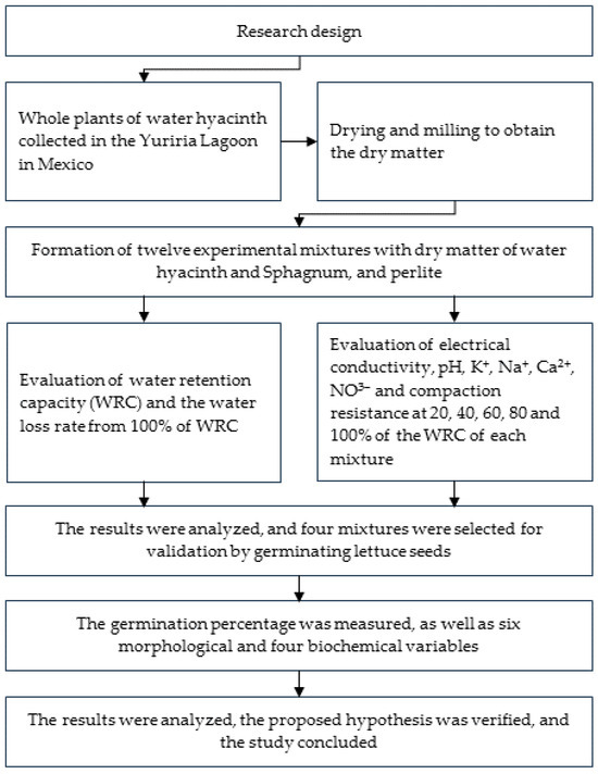 Mixtures of SP100, SP70PE30, SP35WH35PE30, and WH100 were selected, and lettuce seeds of the Siskiyou cultivar Romain type (Seminis, Irapuato, Mexico) were germinated in a growth chamber at 25 °C with a photoperiod of 12:12 h using white LED light at an intensity of 1500 lx. To maintain constant moisture levels, daily irrigations were carried out based on the weight loss corresponding to the water consumed, replacing the amount of water according to each mixture and volume used. The percentage of germination (GE, %) at fourteen days was determined. Seedlings were digitally scanned at 1200 dpi, and from the generated images, the radicle and plumule lengths (RL, PL, cm) were measured. The cotyledon area (CA, mm2) and color parameters in the CIELAB space were determined. The image measurements were performed with the software ImageJ version 1.53t. As a biochemical indicator of stress, the concentration of proline (PRL, µg mL−1) [24] was measured. Similarly, the concentrations of total, a and b chlorophyll (Chlt, Chla, Chlb, mg mL−1) were determined following the methods described by Dudek et al. [25]. A flow chart summarizing the steps is shown in Figure 1.
