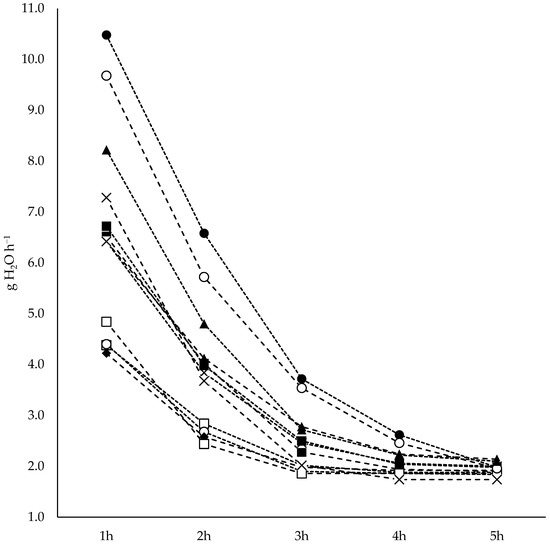 Water loss rate measured at hourly intervals. SP100 (line: ---, marker: ■), SP85PE15 (line: ▪▪▪, marker: □), SP70PE30 (line: ---, marker: ●), SP55PE45 (line: ▪▪▪, marker: ○), SP50WH50 (line: ---, marker: ▲), SP42.5WH42.5PE15 (line: ▪▪▪, marker: ×), SP35WH35PE30 (line: ▪▪▪, marker: ■), SP27.5WH27.5PE45 (line: ---, marker: □), WH100 (line: ▪▪▪, marker: ●), WH85PE15 (line: ---, marker: ○), WH70PE30 (line: ▪▪▪, marker: ▲), and WH55PE45 (line: ---, marker: ×). Water hyacinth dry matter (WH), commercial substrate made from Sphagnum dry matter (SP), and perlite (PE).