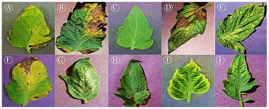 Tomato leaf tissue in classes: (A) Bacterial Leaf Spot, (B) Alternariosis, (C) Asymptomatic, (D) Late Blight, (E) Leaf Mould, (F) Septoria Leaf Spot, (G) Spider Mite, (H) Corynespora Leaf Blight, (I) TYLCV, and (J) ToMV.