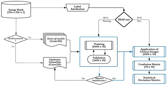 The CNN architectures consisted of sequential processing models in which images of variable dimension were transformed into progressively less-complex features, which were, however, discernible among the included classes. Nine state-of-the-art architectures were implemented using the Python programming language based on the excellent results obtained with a wide variety of targets, namely: LeNet-5 [], AlexNet [], GoogLeNet [], Inception-v3 [], as well as the derivations of the Visual Geometry Group (VGG) [] with 16 and 19 convolutional layers, and ResNet [] with 50 and 152 convolutions. Based on the approaches and results of the above authors, this study also proposed a new architecture, known as GamaNNet, whose parameters were repeatedly adjusted and validated until arriving at the best configuration. GamaNNet was the only network not to require the input images to be resized.