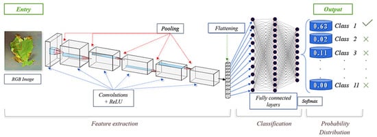 All the convolutional structures (2D) converged to ten neurons, which represent the phytosanitary problems described in this study. As the number of the output layer of the CNNs is equal to the number of classes, each output neuron presented a distinct probability for the test image. For this purpose, the activation function used at the end of each architecture was the ‘Softmax’ function, which normalises the sum of the outputs of all the neurons to an interval between 0 and 1. This function is recommended by [] for multiclass problems, where the probability of the test image belonging to a single class has to be obtained. The authors demonstrated how an increase in the probability of the class i occurs at the expense of reducing the probability of all the other classes in their study (k! = i).