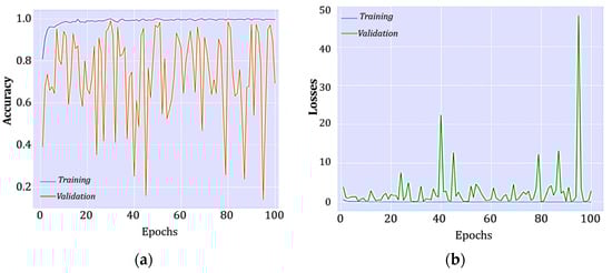 The contrast found between the highest accuracy during validation and the overall accuracy during the test phase is a result of the non-uniform performance of the algorithms when solving multiclass problems, and, in that sense, ResNet-50 showed the greatest discrepancy. A detailed analysis of the accuracy and loss probability curves (Figure 4) shows that the best performances were intercurrent, i.e., learning was not uniform. In contrast to other deep learning models, this architecture was not successful in progressively assimilating the variations in each disease. It rarely achieved validation accuracies greater than 90%, and, as such, the fluctuating rates of diagnostic accuracy compromised its overall performance.