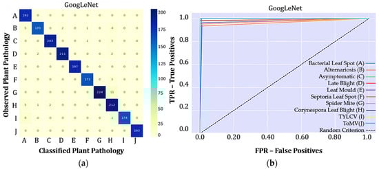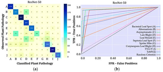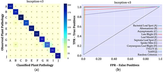 The classes are identified as (A) Bacterial Leaf Spot, (B) Alternariosis, (C) Healthy, (D) Late blight, (E) Leaf Mould, (F) Septoria Leaf Spot, (G) Spider Mite, (H) Corynespora Leaf Blight, (I) TYLCV, and (J) ToMV. The ROC curve is a probability curve, while the AUC represents the degree of separability, i.e., it informs how much the model is able to distinguish between classes. The higher the AUC value in Figure 5b, the better the model is in correctly diagnosing the pathology (Figure 5a).
