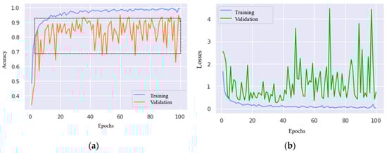 The reflection of this time–efficiency binomial on training can be seen in lower computational costs and in the speed of improvement that such networks can achieve, in addition to the depth of the network, a reasonable number of trained parameters, and the non-linearity (ReLU) applied after each convolutional layer. According to [], this activation function alone can reduce the training time when compared to other functions such as ‘Tanh’ and ‘Sigmoid’.