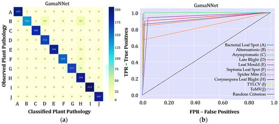 The confusion matrix and ROC curve prepared for this network also displayed susceptibility when labelling plants affected with Alternariosis (Figure 9), diagnosing Late Blight (D) and Corynespora Leaf Blight (H). In fact, the latter received far more incorrect samples than any other class. As for improvement, GamaNNet was satisfactorily able to detect Bacterial Leaf Spot (A) and healthy leaves (C), as well as the viruses TYLCV (I) and ToMV(J). In this experiment, the performance matched that of the extremely deep ResNet-152 network, with 58 million parameters, and outperformed classic networks like ResNet-50, LeNet-5, VGG-19, and AlexNet.
