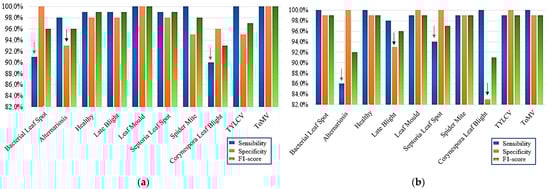 More detailed inspections allowed each architecture to be characterised in terms of its limitations. Sensitivity corresponds to the assertiveness of the CNN computing the proportion of the plants that were correctly diagnosed among the total of plants diagnosed for any given class. Specificity refers to the proportion of the plants correctly diagnosed in any given class among all the plants in the dataset that actually have the disease, i.e., that are in both this and the other classes. In short, sensitivity and specificity assess the positive and negative effectiveness of the algorithm for each class, while the F1-score groups these two perspectives into a single index.