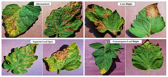 In order to reduce any bias in the image bank during classification, the samples were evenly distributed (n = 1000) between the classes. The contrasting background highlighted leaf tissue under varying levels of severity in infections by (i) Bacterial Leaf Spot; (ii) Alternariosis; (iii) Late blight; (iv) Leaf Mould; (v) Septoria Leaf Spot; (vi) Corynespora Leaf Blight; (vii) Tomato Yellow Leaf Curl (TYLCV); (viii) Tomato Mosaic (ToMV); and infestation by (viii) Spider Mite. The individual samples of the regimented dataset are shown in Figure 1 and their classes are described in Table S1 (Supplementary Materials).
