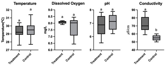 Water quality parameters in control (dechlorinated water) and treatment (M. amazonicum wastewater) groups of the aquaponic system. Graphs show average values of temperature, dissolved oxygen, pH, and electrical conductivity during the experiment.